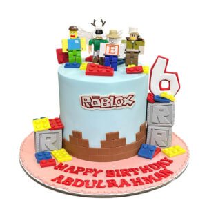 Celebrate with our Roblox Avatar Cake, featuring a light blue base with brown block accents, topped with multiple Roblox character figurines and a bold “ROBLOX” logo. Colorful building blocks and a red-and-white number topper complete the gaming setup. A fun and immersive centerpiece for fans of Roblox and creative play. Order now for next-day delivery in Dubai, Sharjah, and Ajman.