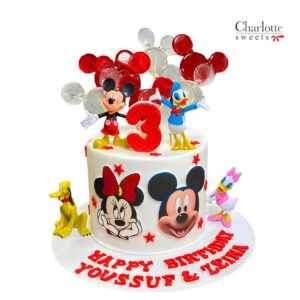 Celebrate your birthday with this delightful Mickey and Minnie Mouse cake! This single-tier cake features both Mickey and Minnie Mouse, bringing double the joy to the celebration. The cake is adorned with colorful polka dots and star-shaped decorations, adding a playful touch. A bright red “3” topper marks the special age. “HAPPY BIRTHDAY YOUSSUF & ZEINA” is inscribed on the red cake board. Order online for next-day delivery in Dubai, Sharjah, and Ajman.