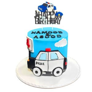 Celebrate with our Police Car Cake, featuring a blue fondant base with a detailed police car, traffic light, cloud accents, and a bold “Happy Birthday” topper. A fun and personalized centerpiece for little heroes and law enforcement-themed celebrations. Order now for next-day delivery in Dubai, Sharjah, and Ajman.