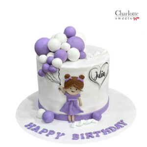 This adorable cake is perfect for a little girl’s birthday. The white base is adorned with a playful girl character, purple and white balloons, and a personalized message. The whimsical design and soft colors make it a charming and delightful treat. Order online for next-day delivery in Dubai, Sharjah, and Ajman.