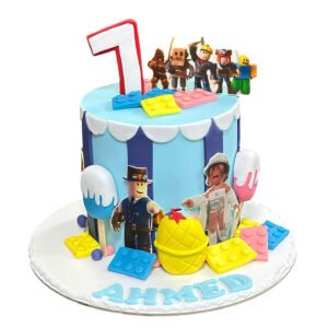 Celebrate with our Roblox Character Cake, featuring a blue base with vertical white and navy stripes, topped with Roblox character figurines and a bold red-and-white number “7.” Colorful fondant blocks and a custom name complete the playful setup. A vibrant and personalized centerpiece for Roblox fans and themed celebrations. Order now for next-day delivery in Dubai, Sharjah, and Ajman.