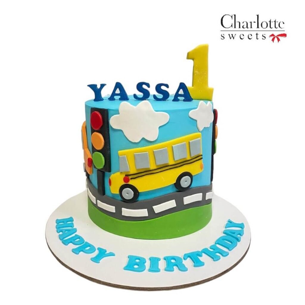 Celebrate your little one’s 1 Year Birthday Cake with this adorable bus cake design! Featuring a bright yellow school bus, traffic lights, and fluffy clouds, this cake is sure to delight any child. Order now and make their special day extra sweet. Perfect for a first birthday party. Order online for next-day delivery in Dubai, Sharjah, and Ajman.
