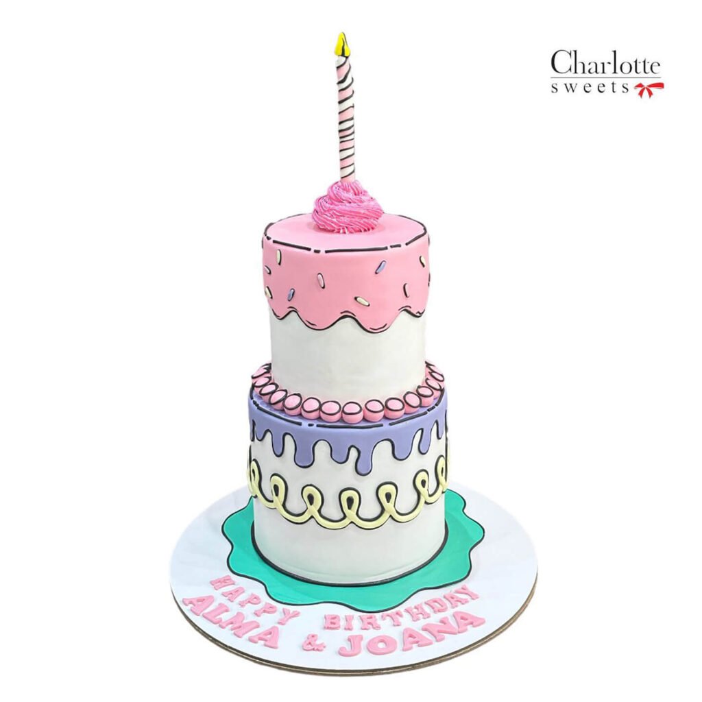 This whimsical two-tiered birthday cake is a playful and colorful celebration. The cake features a cartoonish design with thick black outlines, creating a fun and unique look. Each tier showcases a different pastel color scheme, with pink, white, and purple layers, all adorned with dripping icing effects. A pink frosting swirl tops the cake, and a tall, striped candle with a yellow flame adds a festive touch. The cake rests on a white cake board with a teal scalloped edge, and the inscription Message is written in pink lettering, making it a personalized and joyful celebration. Order online for next-day delivery in Dubai, Sharjah, and Ajman.