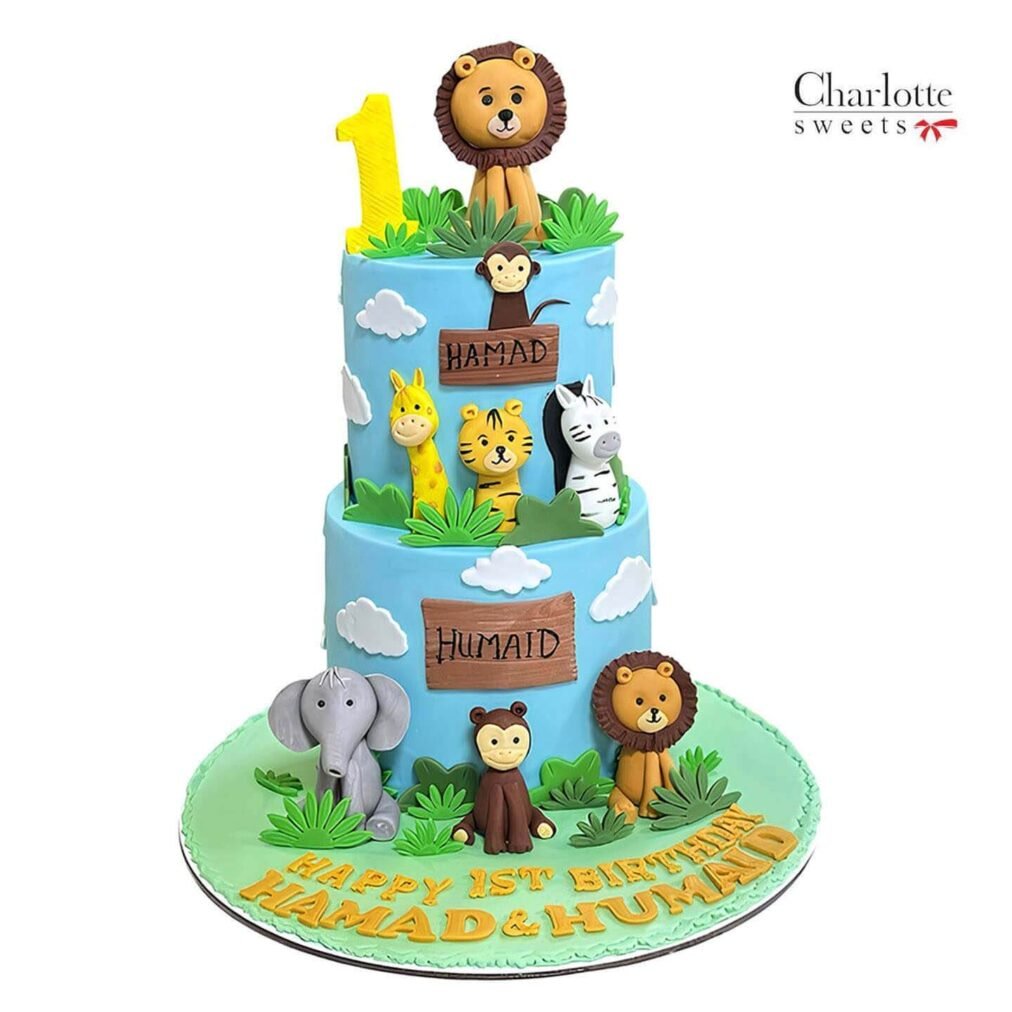 Celebrate with our 2 Tier Jungle Cake, featuring a vibrant green base adorned with fondant jungle animals, including a lion, monkey, giraffe, tiger, zebra, and elephant. The top tier showcases a lion holding a yellow number “1” and a monkey, with the name “HAMAD” written on a wooden sign. The bottom tier has the name “HUMAID” on a wooden sign, surrounded by the giraffe, tiger, and zebra. The cake base includes the message “HAPPY 1ST BIRTHDAY HAMAD & HUMAID,” making it a perfect centerpiece for a jungle-themed celebration. Order now for next-day delivery in Dubai, Sharjah, and Ajman.