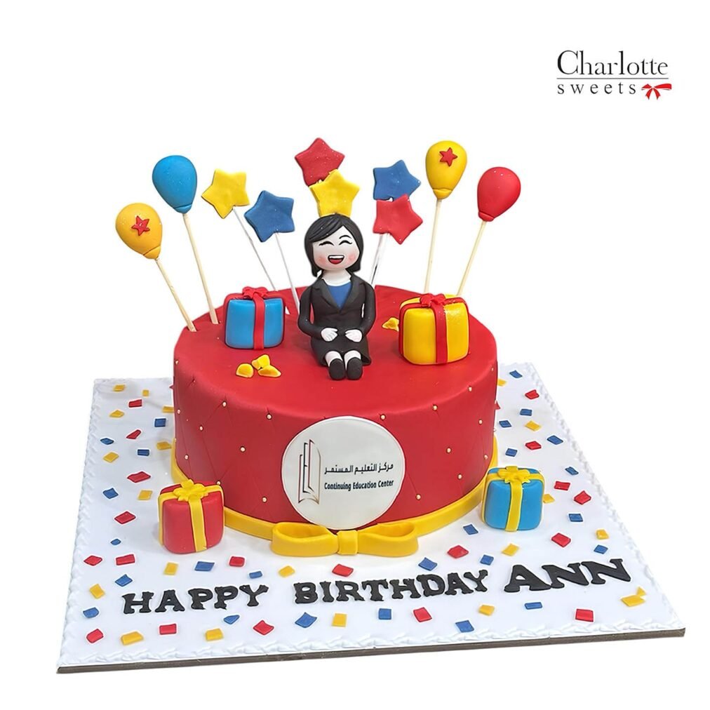 Celebrate with our 3D Birthday Cake, featuring a striking red base adorned with yellow and blue decorations, including balloons, stars, and gift boxes. The top showcases a figure dressed in black, sitting amidst the festive elements. The cake includes the logo “Continuing Education Center” in both English and Arabic, adding a personalized touch. The base is decorated with colorful confetti and the message “HAPPY BIRTHDAY ANN” written in bold letters. Order now for next-day delivery in Dubai, Sharjah, and Ajman.