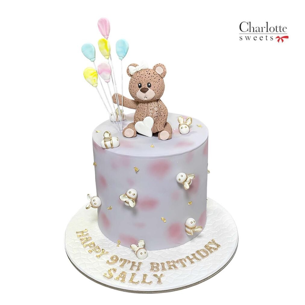 This is a cake with a soft, whimsical design, featuring a teddy bear figurine holding balloon decorations. The cake has a light purple and white spotted pattern, small white bee accents, and the message “HAPPY 9TH BIRTHDAY SALLY” in gold lettering. The base is white. Order online for next-day delivery in Dubai, Sharjah, and Ajman.