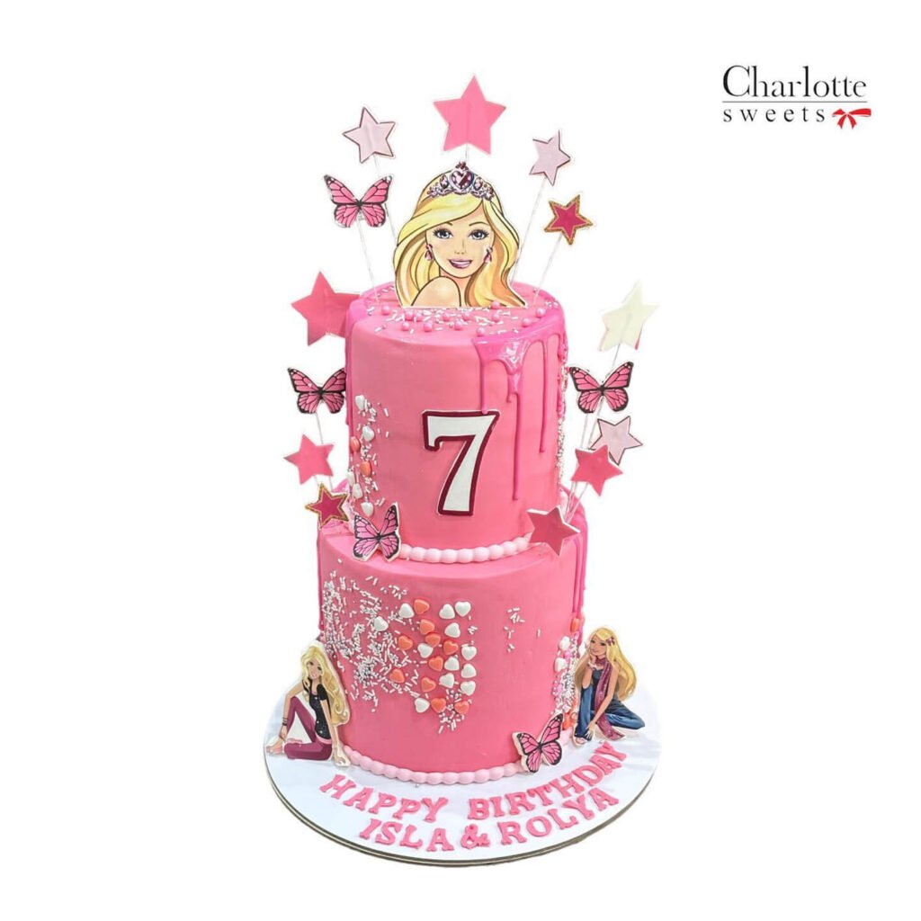 This delightful two-tiered cake is covered in a vibrant pink frosting and adorned with a sparkling and number 7. The cake is further decorated with images of Barbie, butterflies, and stars, creating a magical and whimsical atmosphere. Order online for next-day delivery in Dubai, Sharjah, and Ajman.
