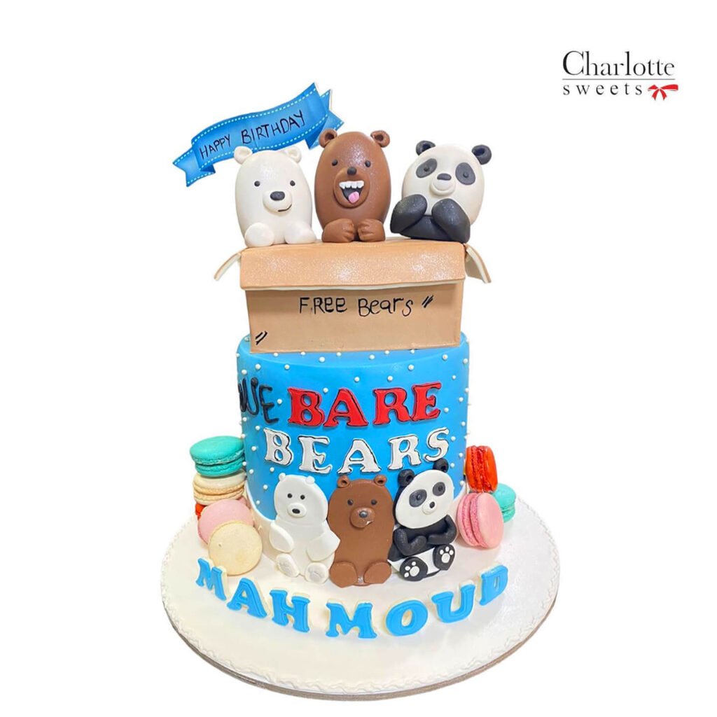 Celebrate with this adorable We Bare Bears cake! This two-tiered cake features Ice Bear, Grizzly, and Panda in charming fondant form. The bears are depicted peeking out of a “Free Bears” box on the top tier and sitting together on the bottom tier, creating a playful design. The “WE BARE BEARS” logo adds authenticity, and colorful macarons enhance the whimsical theme. A “HAPPY BIRTHDAY” banner and Mahmoud’s name in blue lettering on the cake board personalize this fun and sweet celebration cake. Order online for next-day delivery in Dubai, Sharjah, and Ajman.