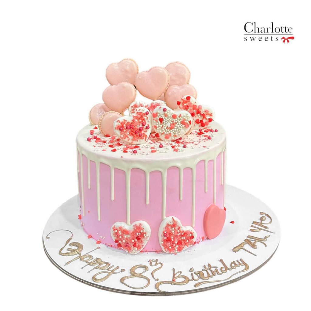 This romantic cake is perfect for a birthday or any special occasion. The soft pink color, combined with heart-shaped macarons and sprinkles, creates a sweet and loving atmosphere. The personalized “Happy Birthday” message adds a special touch. Order online for next-day delivery in Dubai, Sharjah, and Ajman.