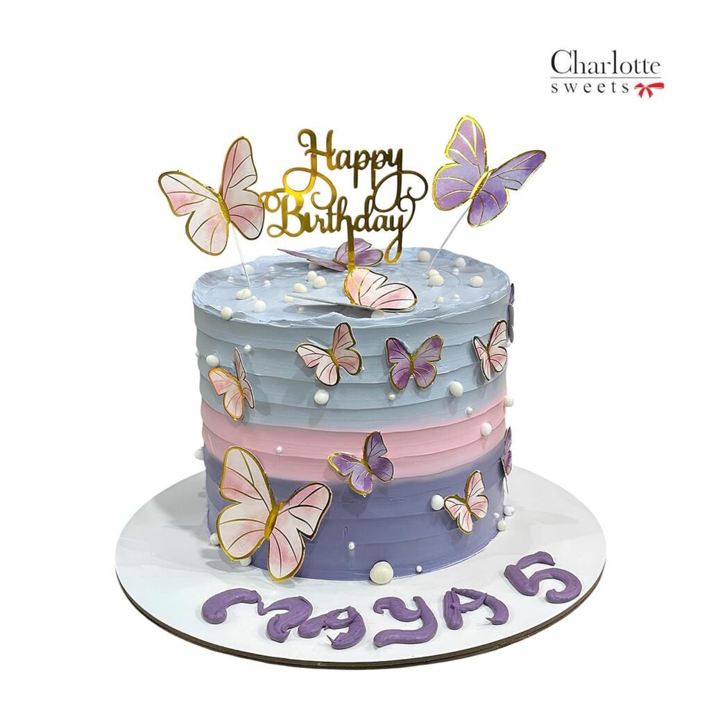 Gradient round cake, a blend of purple, blue, and pink, adorned with delicate gold-outlined butterfly decorations in pastel shades. A gold ‘Happy Birthday’ topper adds festive flair. ‘Maya 5’ is elegantly scripted in purple icing, perfect for celebrations. This artistically crafted cake exudes charm and joy. Next-day delivery in Dubai, Sharjah, and Ajman.