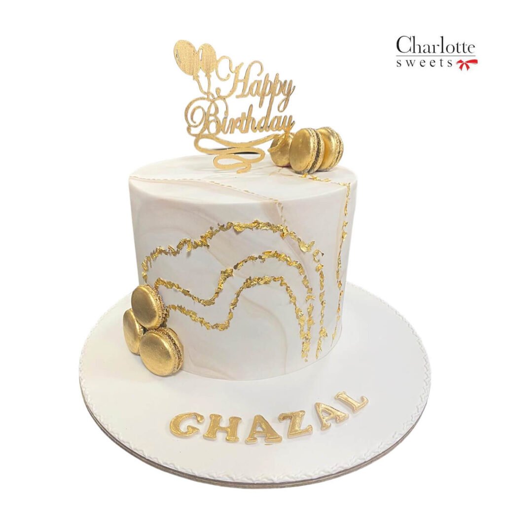 This elegant cake is perfect for a special birthday celebration. The marbleized design, combined with gold leaf accents and delicate macarons, creates a luxurious and sophisticated look. The personalized “GHAZAL” message adds a special touch. Order online for next-day delivery in Dubai, Sharjah, and Ajman.