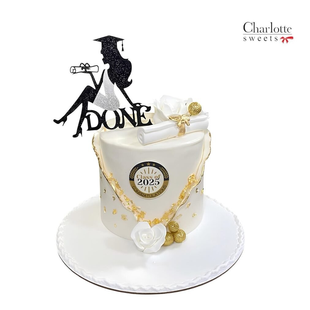 Celebrate academic achievements with our stunning Best Graduation Cake, featuring elegant white and gold details, a black graduate silhouette, and a rolled-up diploma decoration. With lifelike roses, gold accents, and a badge reading “Class of 2025,” this cake is the perfect centerpiece for graduation parties. Order online for next-day delivery in Dubai, Sharjah, and Ajman.