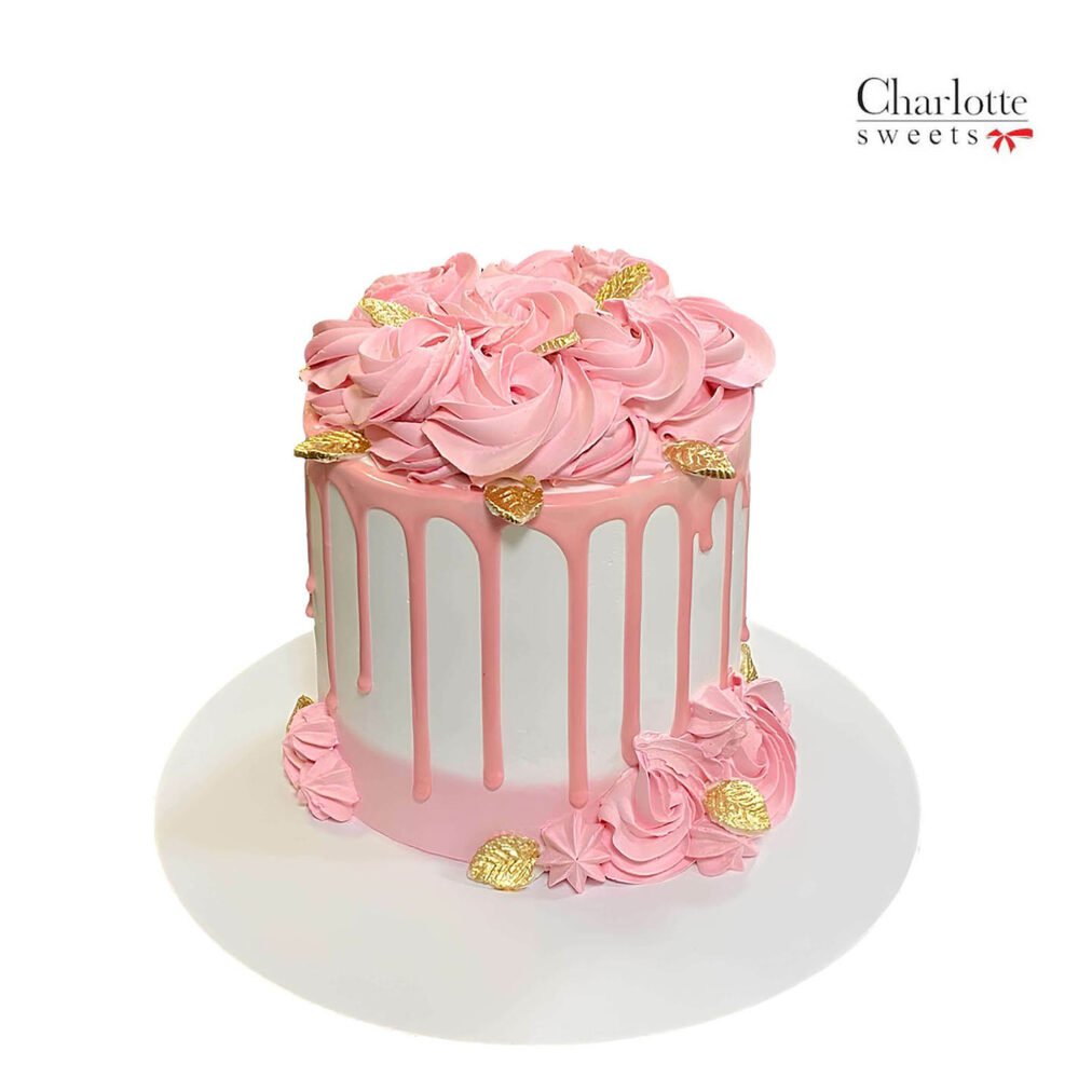 Make your birthday moments unforgettable with our exquisite Birth Day Cake, adorned with cascading pink frosting drips and topped with intricate pink frosting swirls resembling roses. Gold-colored decorative leaves and hearts add a luxurious touch, creating a perfect centerpiece for your celebration. Order online for next-day delivery in Dubai, Sharjah, and Ajman.