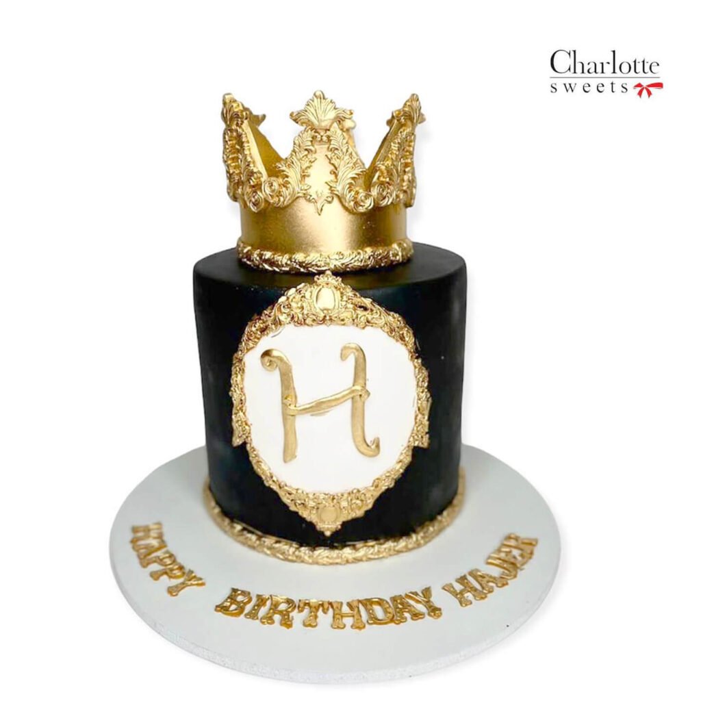 Celebrate with regal elegance with this unique birthday cake. The cake features a sophisticated black base, topped with a majestic gold crown, symbolizing royalty and celebration. A gold-framed white plaque with the initial “H” adds a personalized touch, making it a special gift. The cake rests on a white cake board, inscribed with “HAPPY BIRTHDAY HAJE” in gold lettering, completing this luxurious and celebratory design. Order online for next-day delivery in Dubai, Sharjah, and Ajman.