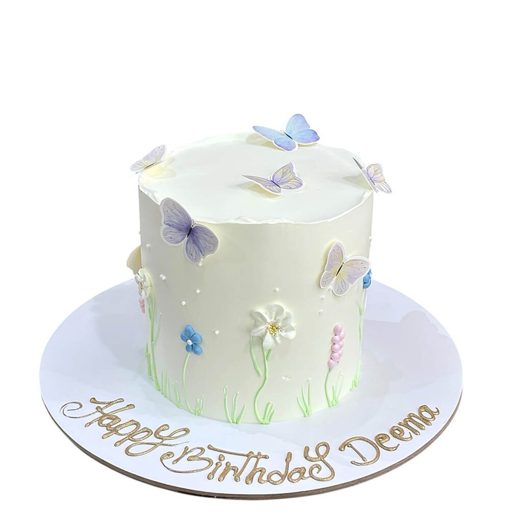 Celebrate with our Birthday Cake For Sister, featuring a smooth white frosting base adorned with pastel butterflies and delicate flowers in pink, blue, and white. The cake includes a personalized gold birthday message and soft green leaf accents. A graceful and heartfelt centerpiece for celebrating your sister’s special day. Order now for next-day delivery in Dubai, Sharjah, and Ajman.