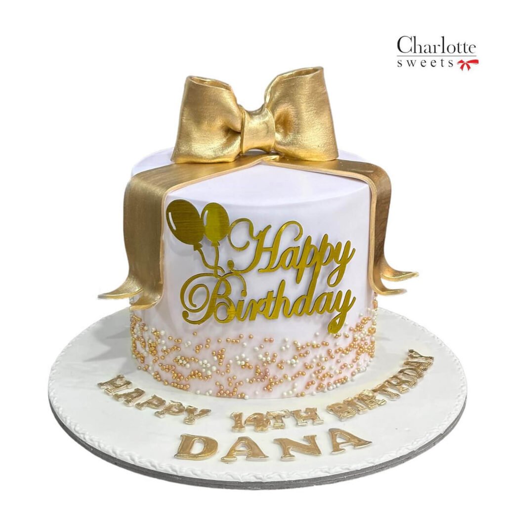 This elegant cake is perfect for a special birthday celebration. The pristine white base is adorned with a golden bow, balloons, and a “Happy Birthday” message, creating a luxurious and festive look. The personalized “Happy 14th Birthday Dana” message adds a special touch. Order online for next-day delivery in Dubai, Sharjah, and Ajman.