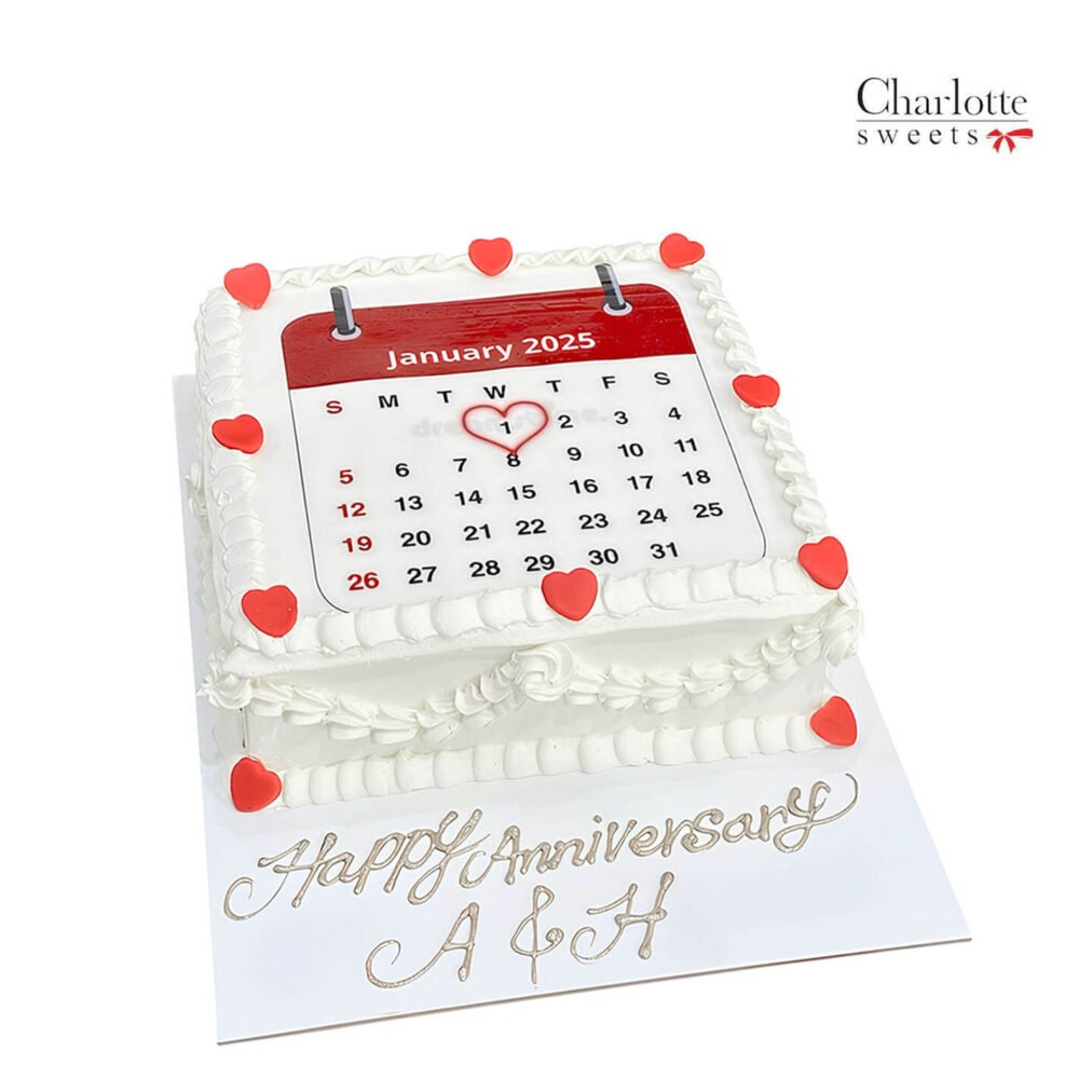 Celebrate with our Birthday Calendar Cake, featuring a white base with a detailed calendar design on top. The calendar highlights January 2025, with a red heart marking the 1st of January. The cake is adorned with red heart shapes around the edges, adding a touch of elegance. The base includes the personalized message “Happy Anniversary A & H” written in gold icing, making it a perfect centerpiece for birthdays, anniversaries, or any special occasion. Order now for next-day delivery in Dubai, Sharjah, and Ajman.