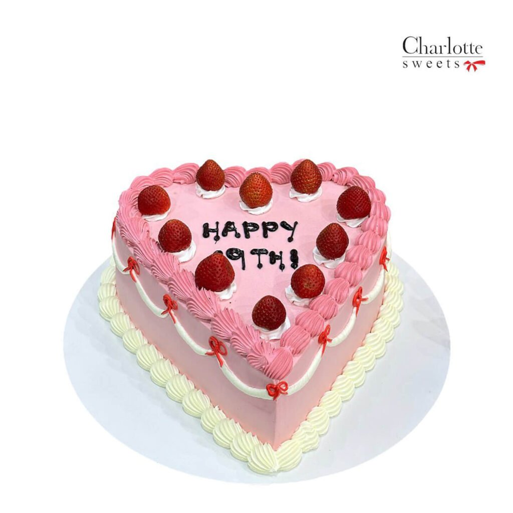 Celebrate a special 9th birthday with this charming heart-shaped cake! This delightful cake features a soft pink base, perfect for a young birthday star. The cake is lovingly decorated with delicate pink and white buttercream swirls, creating a whimsical and delightful look. Fresh strawberries are artfully arranged around the cake, adding a burst of color and a touch of natural sweetness. Order online for next-day delivery in Dubai, Sharjah, and Ajman.