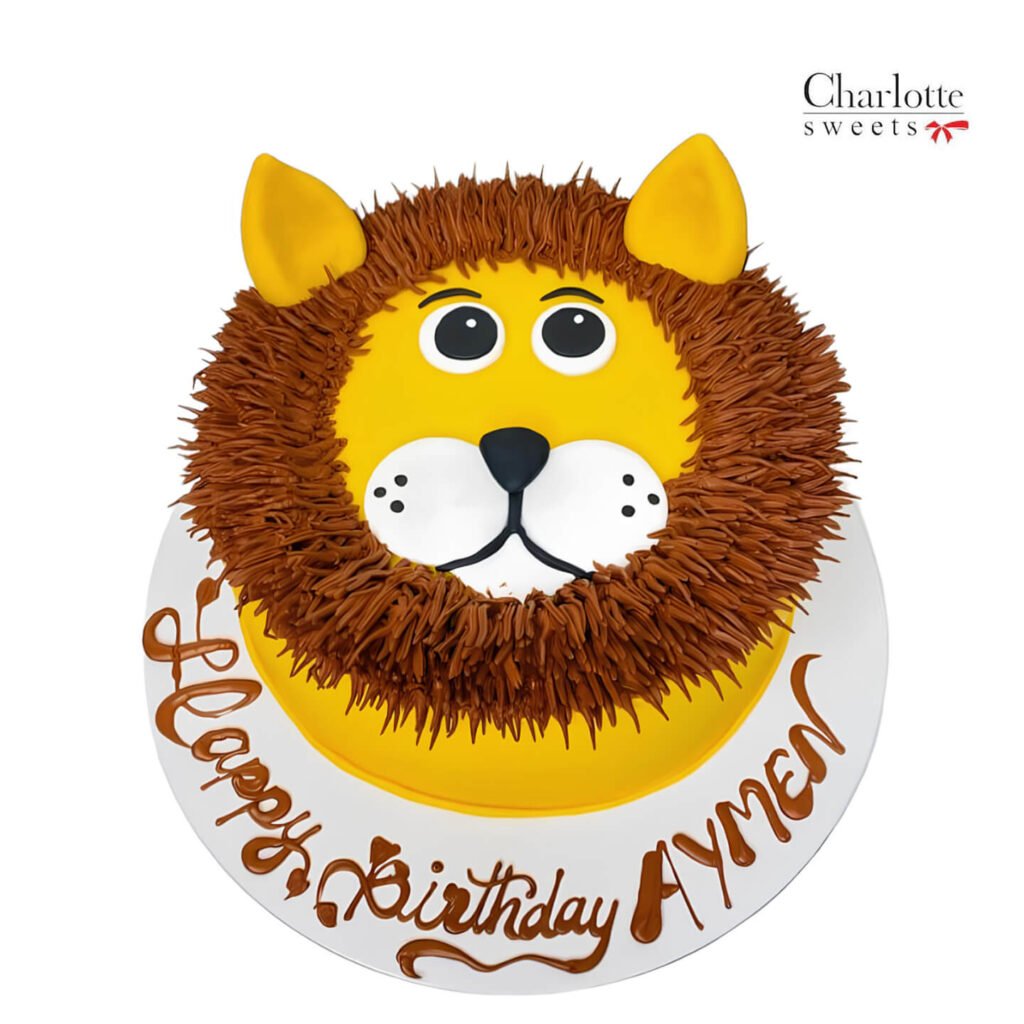 Celebrate birthday with this adorable lion-themed cake! This single-tier cake is shaped like a cheerful lion’s face, featuring a bright yellow center and a fluffy brown mane created with textured buttercream. The lion’s eyes, nose, and mouth are crafted with fondant, adding a playful touch. “Happy Birthday ” is elegantly scripted on the cake board, making it a personalized and joyous centerpiece for a special celebration. This cake is a perfect blend of whimsy and sweetness, ideal for a memorable birthday. Order online for next-day delivery in Dubai, Sharjah, and Ajman.