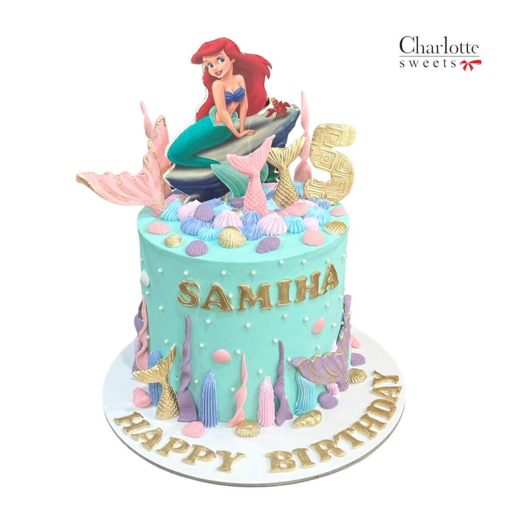 This cake features an Ariel the Mermaid theme with an Ariel figurine. It includes mermaid tail decorations and seashell accents. The cake has a light blue fondant base with the name “SAMIHA.” A “5” candle is prominently displayed. The base is scripted with “HAPPY BIRTHDAY” in gold lettering. This is a charming centerpiece for a celebration. Order online for next-day delivery in Dubai, Sharjah, and Ajman.