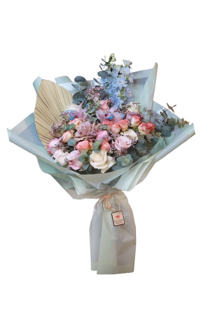 Elegant bouquet with pastel pink and white roses, Blue Cymbidiums, blue delphiniums, dried palm leaf, and fresh eucalyptus. Perfect for Birthdays, weddings, anniversaries, or any celebration. Order now for delivery in Dubai, Sharjah, and Ajman.