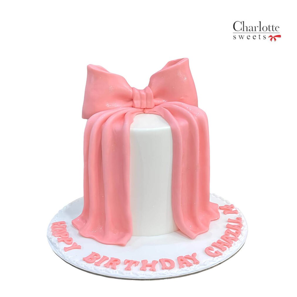 Celebrate with our Bow Cake, featuring a smooth white frosting base adorned with a large pink bow on top. The bow has flowing ribbons that cascade gracefully down the sides of the cake. The base includes the personalized message “Happy Birthday Charal M” written in pink icing, making it a perfect centerpiece for birthdays or sophisticated celebrations. Order now for next-day delivery in Dubai, Sharjah, and Ajman.