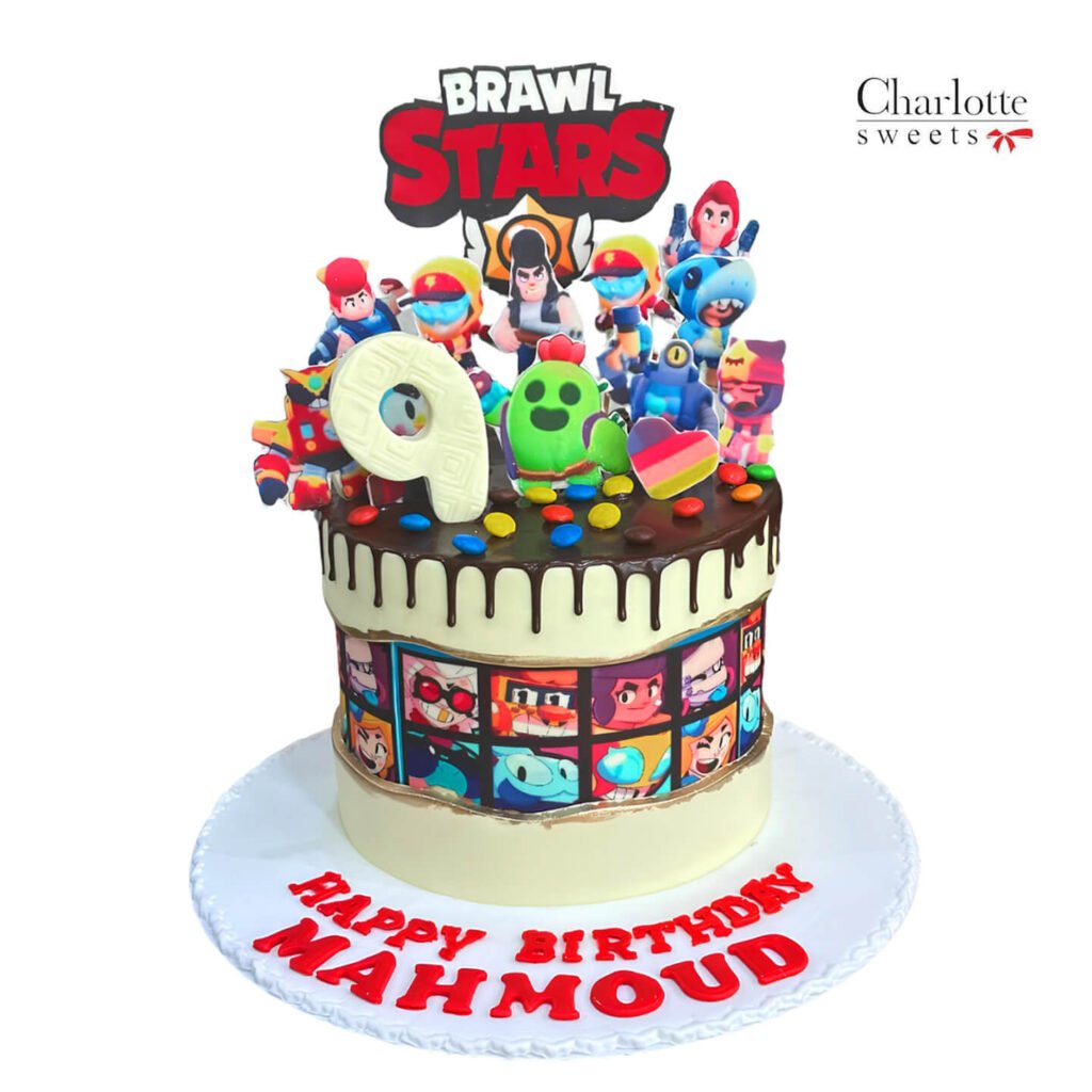 Celebrate with this action-packed Brawl Stars cake! This single-tier cake features a vibrant design with iconic Brawl Stars characters and a “BRAWL STARS” topper. The cake is adorned with colorful candies and a chocolate drip, adding a playful touch. Mahmoud’s name is prominently displayed on the cake board, along with “HAPPY BIRTHDAY” and a “9” topper, making it a personalized and exciting centerpiece for the celebration. Order online for next-day delivery in Dubai, Sharjah, and Ajman