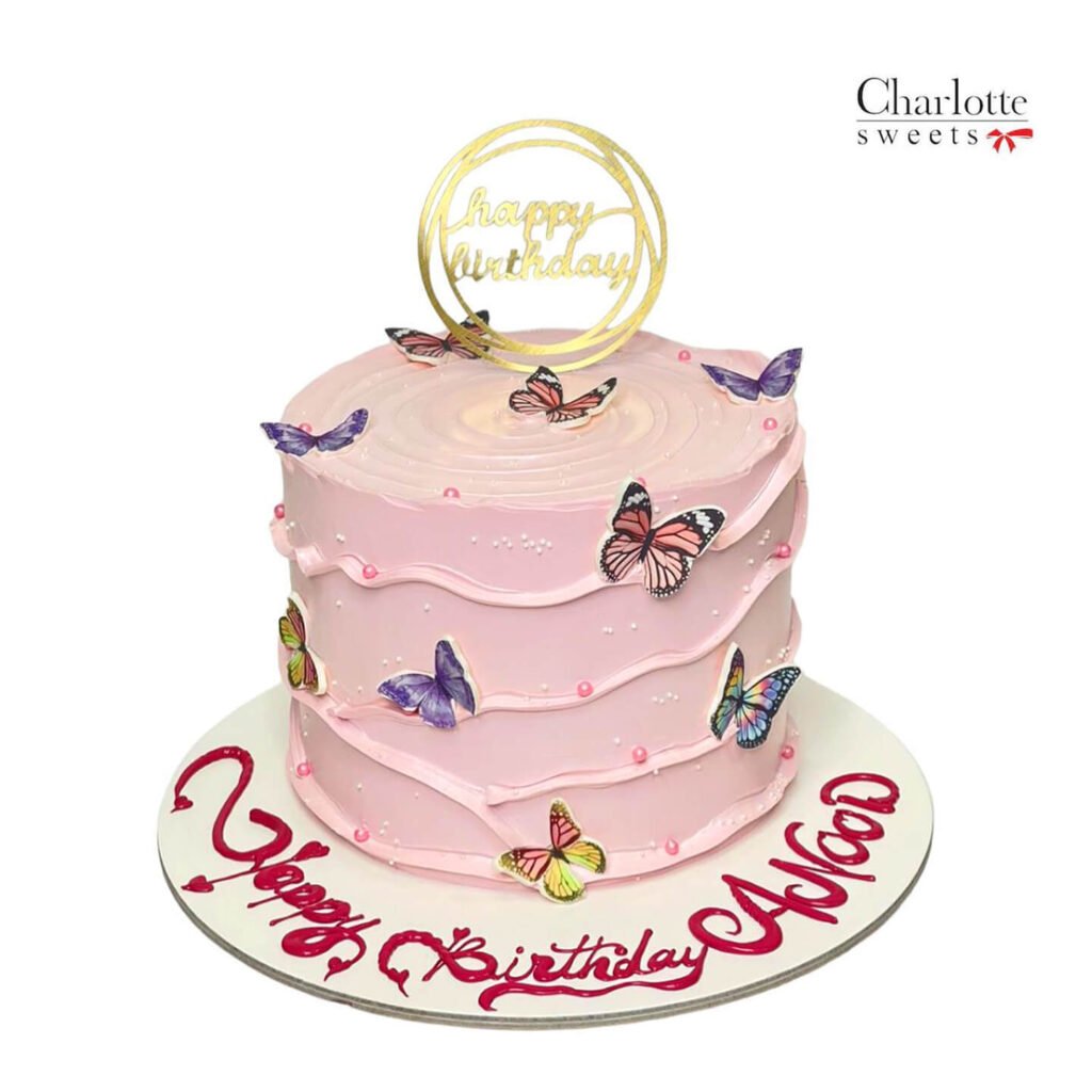 This enchanting cake is perfect for a birthday or any special occasion. The soft pink color, combined with delicate butterfly decorations and a golden “Happy Birthday” topper, creates a magical and dreamy atmosphere. The personalized message adds a special touch. Order online for next-day delivery in Dubai, Sharjah, and Ajman.