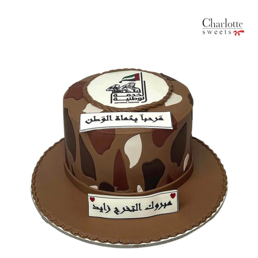 This is a cylindrical cake designed to resemble a military cap, featuring a camouflage pattern in shades of brown and beige. The top of the cake showcases a circular emblem with the UAE flag and the text “الخدمة الوطنية NATIONAL SERVICE,” along with the phrase “مرحباً بحماة الوطن” (Welcome to the protectors of the nation). A rectangular plaque reads. Order online for next-day delivery in Dubai, Sharjah, and Ajman.