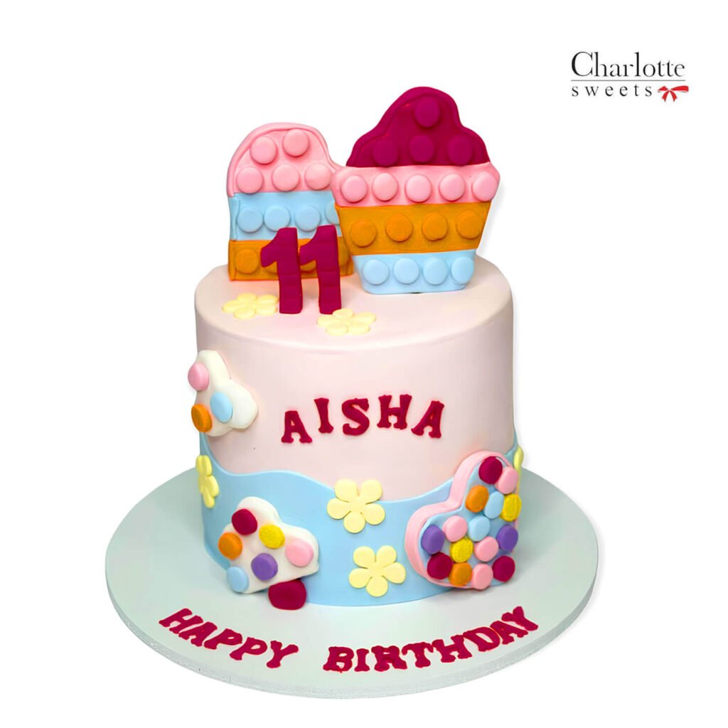 Celebrate Aisha’s 11th birthday with this whimsical Lego-themed cake! This single-tier cake features a soft pastel palette, adorned with colorful Lego-inspired shapes, bringing the popular sensory toy to life. Aisha’s name is prominently displayed, making it a personalized and playful centerpiece for a young celebrant’s special day. The number “11” marks the milestone, while “HAPPY BIRTHDAY” is elegantly scripted, completing this fun and festive cake. Order online for next-day delivery in Dubai, Sharjah, and Ajman.