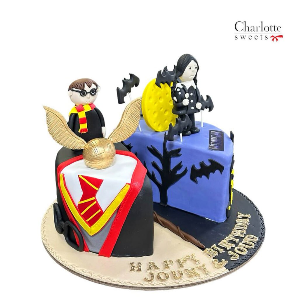 Celebrate with this unique Harry Potter and Wednesday Addams-themed cake! This cake features two distinct sections, one representing Harry Potter with a Gryffindor scarf, golden snitch, and a figurine, and the other representing Wednesday Addams with a silhouette of her figure, bats, and a tree against a purple backdrop. “HAPPY BIRTHDAY JOUD & JOUKE” is scripted around the cake board, making it a personalized and creative centerpiece for a joint celebration. Order online for next-day delivery in Dubai, Sharjah, and Ajman.