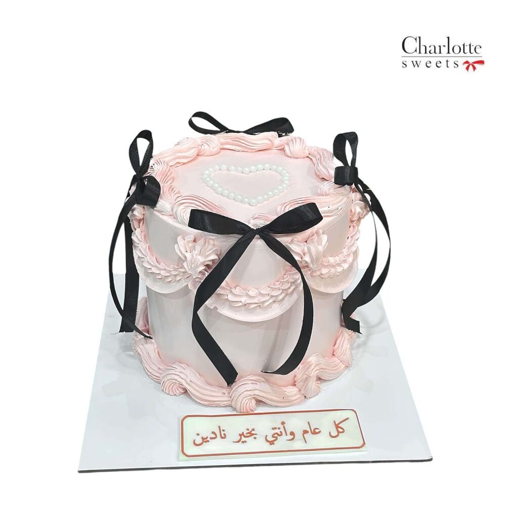 This pink cake features a light pink base with intricate frosting decorations and black ribbon accents. It includes a small white heart design in the center and the Arabic message (Happy Birthday Nadine) on a white plaque. The cake is set on a light gray base. Order online for next-day delivery in Dubai, Sharjah, and Ajman.