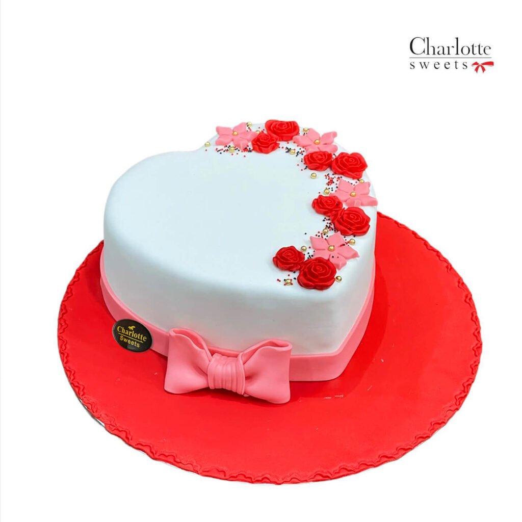 This elegant heart-shaped cake is a perfect for valentine, anniversary or birthday. The white base is adorned with a beautiful arrangement of red roses, creating a romantic and sophisticated look. A delicate pink bow adds a touch of charm. Order online for next-day delivery in Dubai, Sharjah, and Ajman.