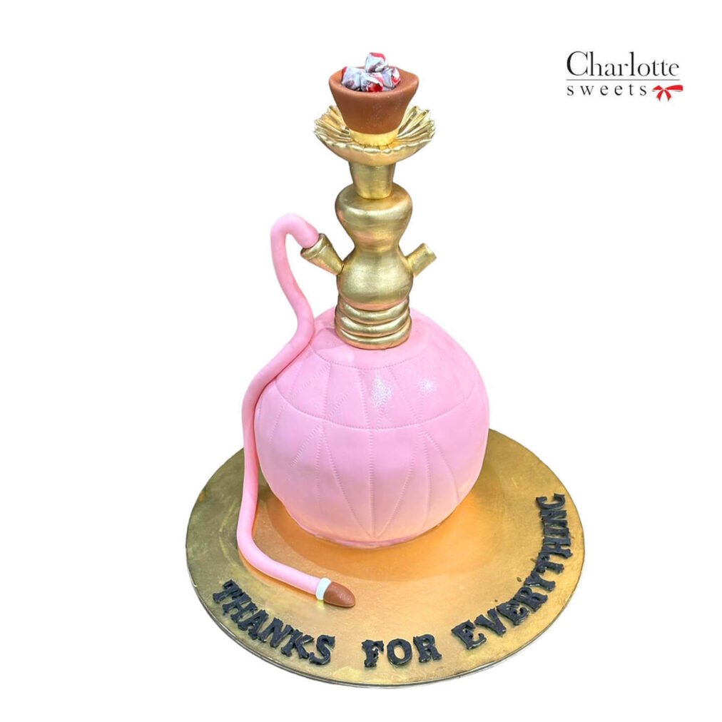This cake is sculpted to resemble a hookah, featuring a pink, textured base shaped like the water chamber, a gold-colored stem, and a bowl filled with edible “coals.” The cake is set on a gold-colored base with the inscription “THANKS FOR EVERYTHING” in black lettering. Order online for next-day delivery in Dubai, Sharjah, and Ajman.
