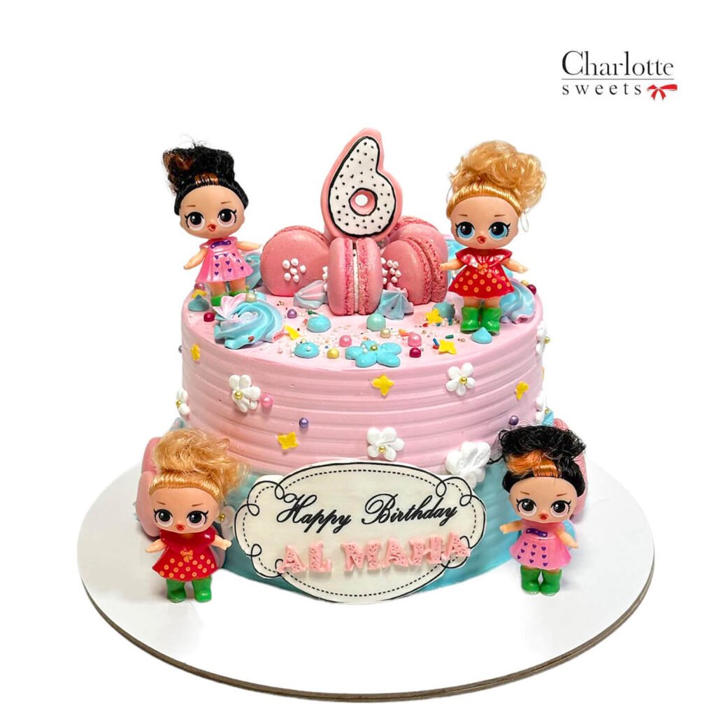 Celebrate with this beautifully decorated pink birthday cake featuring an LOL Surprise doll theme. It is topped with four adorable doll figurines, a pink number “6” cookie, and pastel macarons. The cake is adorned with colorful sugar pearls, stars, and tiny flowers for a playful touch. A custom name plaque reading “Happy Birthday AL MAHA” adds a personalized charm. Sitting on a white base, this delightful cake is a perfect centerpiece for a fun celebration. Order ted Cake LOL Surprise with Name Customization