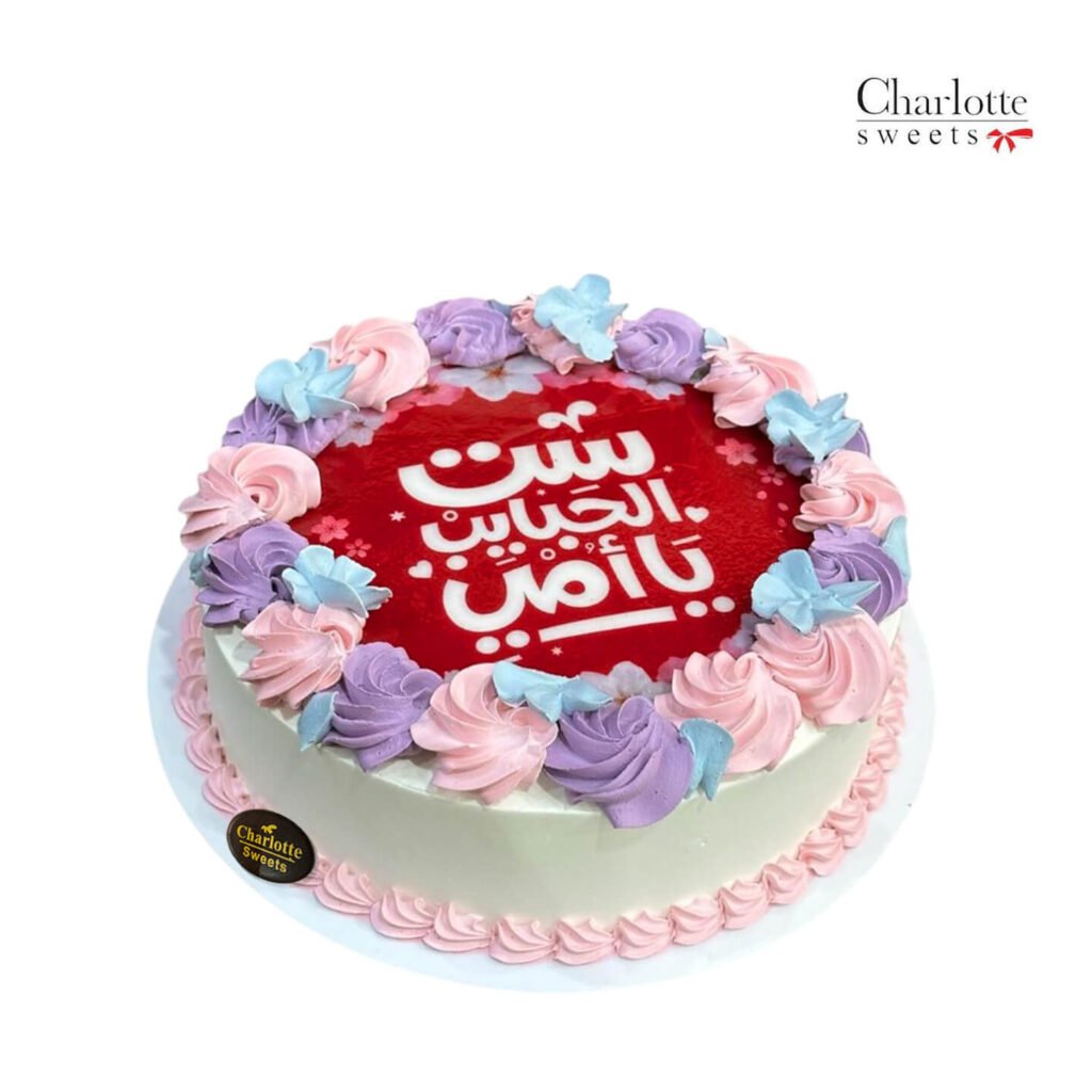 This elegant mother cake is a perfect way to celebrate Mother’s Day. The white base is adorned with a delicate border of pink and purple buttercream swirls, creating a romantic and feminine look. In the center, a red heart showcases a beautiful Arabic message of love and appreciation for a mother. Order online for next-day delivery in Dubai, Sharjah, and Ajman.