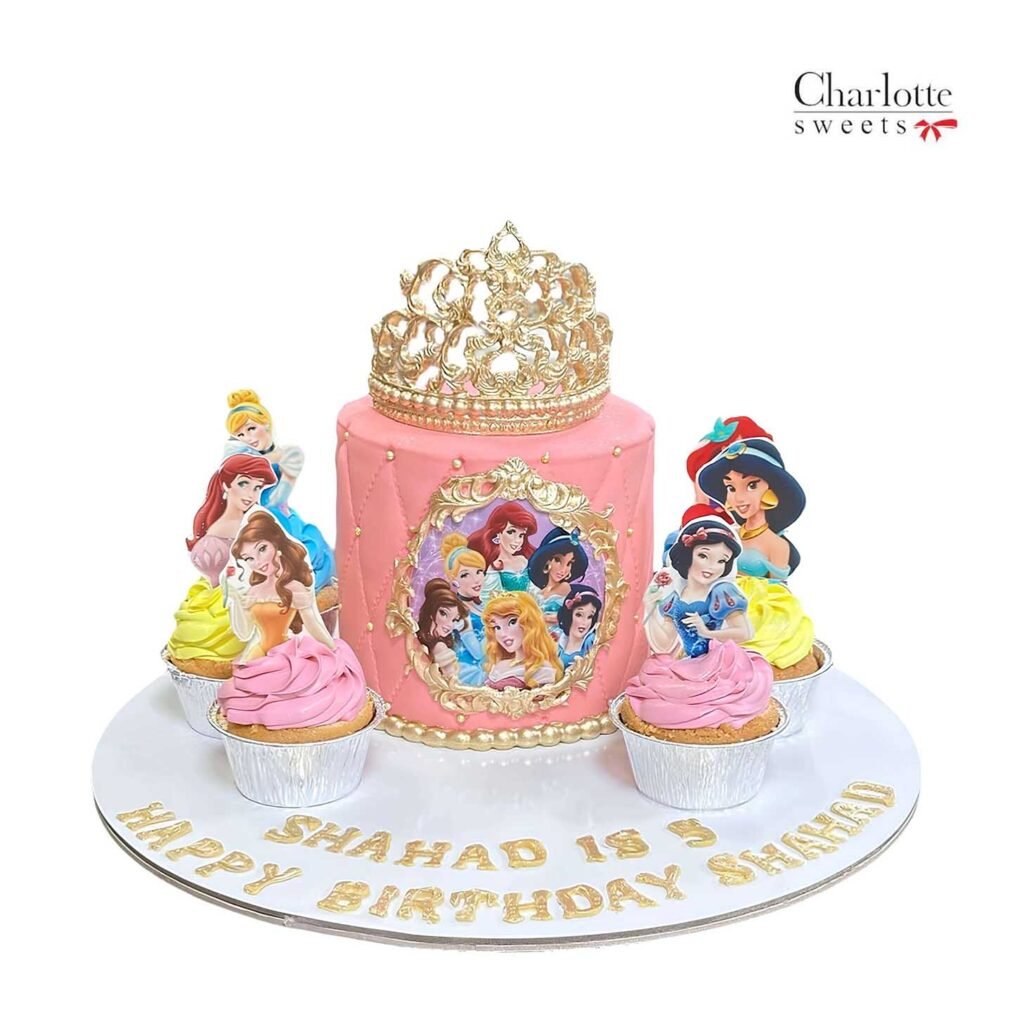 This is a Disney Princess themed cake, featuring a pink tier with a central oval frame showcasing an image of various princesses. The cake is adorned with a gold crown topper, princess cutouts, and cupcakes with pink frosting. The base displays the message “HAPPY BIRTHDAY SHAHAD IS 9 SHAHAD” in gold lettering. Order online for next-day delivery in Dubai, Sharjah, and Ajman.