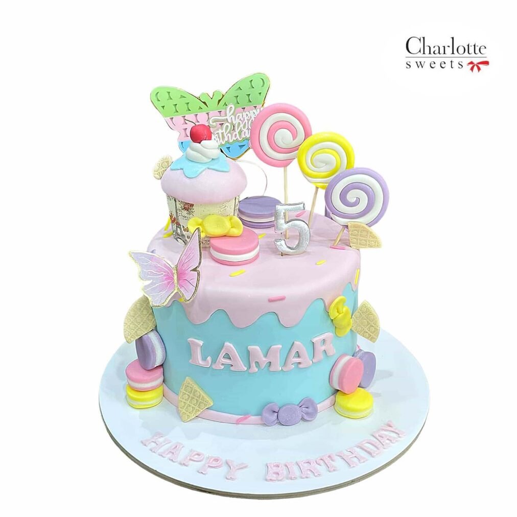 This cake features a vibrant Candy Land theme with a pastel pink and blue color scheme. It’s adorned with a cupcake topper, lollipops, macarons, and wafer accents. A butterfly embellishment adds a whimsical touch. The name “LAMAR” is prominently displayed on the cake, along with a “5” candle. The cake board is scripted with “HAPPY BIRTHDAY.” This cake is a sweet and playful centerpiece for a celebration. Order online for next-day delivery in Dubai, Sharjah, and Ajman.