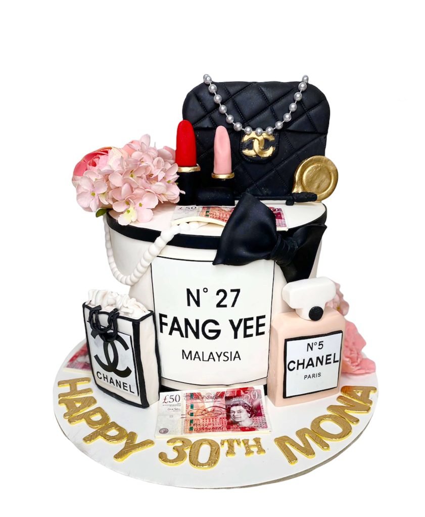 Celebrate in style with this luxurious Chanel-inspired cake! This glamorous cake features a gift box design adorned with a black Chanel handbag, a pearl necklace, a lipstick, and a perfume bottle. The cake is personalized with the name “Mona” and the number “30,” making it a truly special and memorable treat.