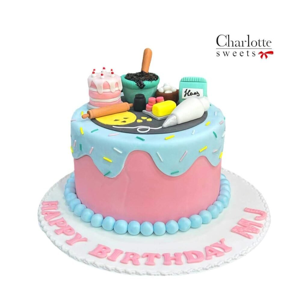 This adorable baking-themed cake is a perfect way to celebrate a birthday for a chef who loves to bake! Featuring a fondant design with a variety of baking tools and ingredients, this Chef Cake is sure to be a hit with any baker. Order now and make their special day extra sweet. Order online for next-day delivery in Dubai, Sharjah, and Ajman.