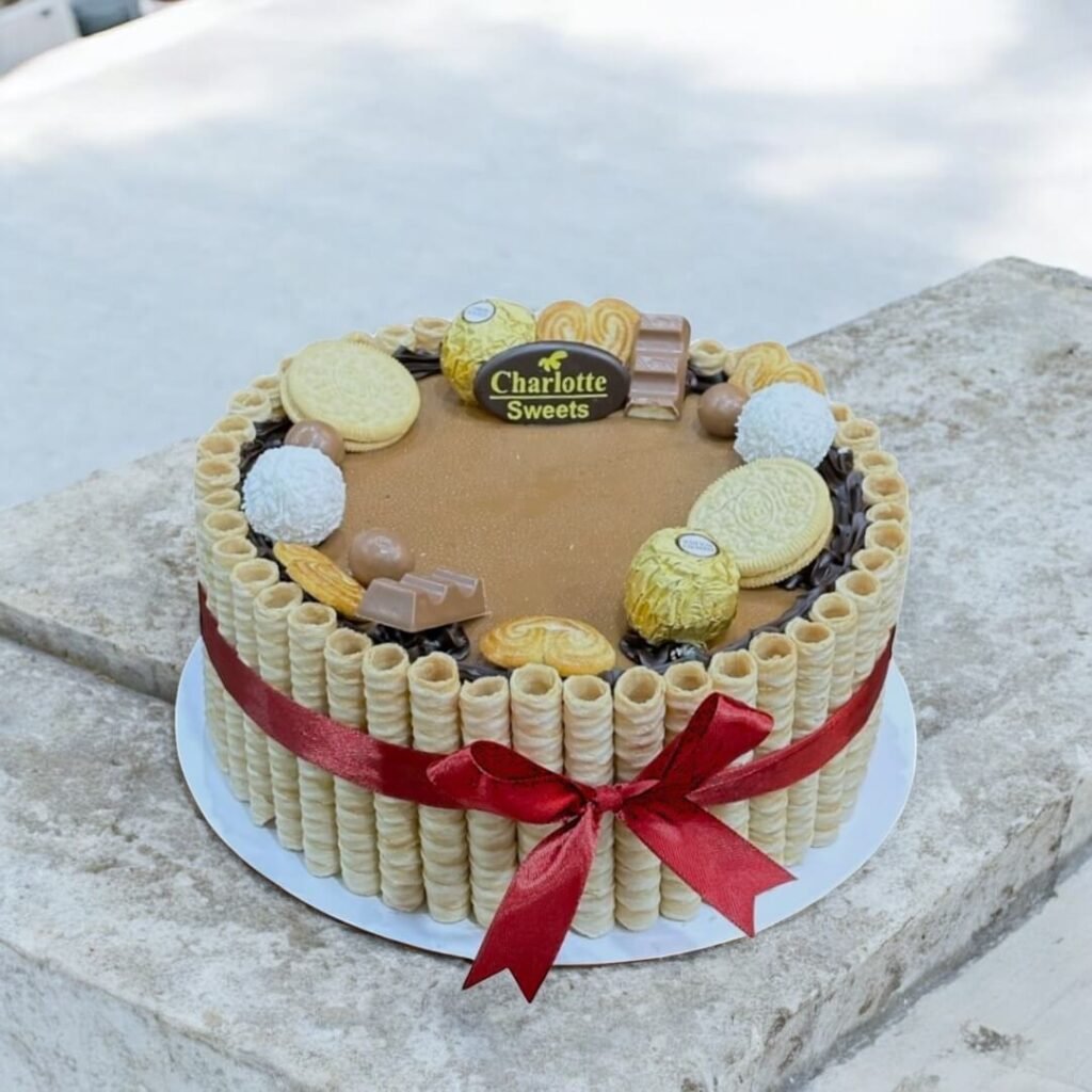 This delectable cake features a rich chocolate layer and a vanilla layer, creating a perfect balance of flavors. The cake is adorned with a border of wafer fingers and topped with a variety of chocolate candies, creating a visually stunning and indulgent dessert. Perfect for birthdays, celebrations, or simply a sweet treat, this cake is sure to bring a smile to your face. Order online for next-day delivery in Dubai, Sharjah, and Ajman.