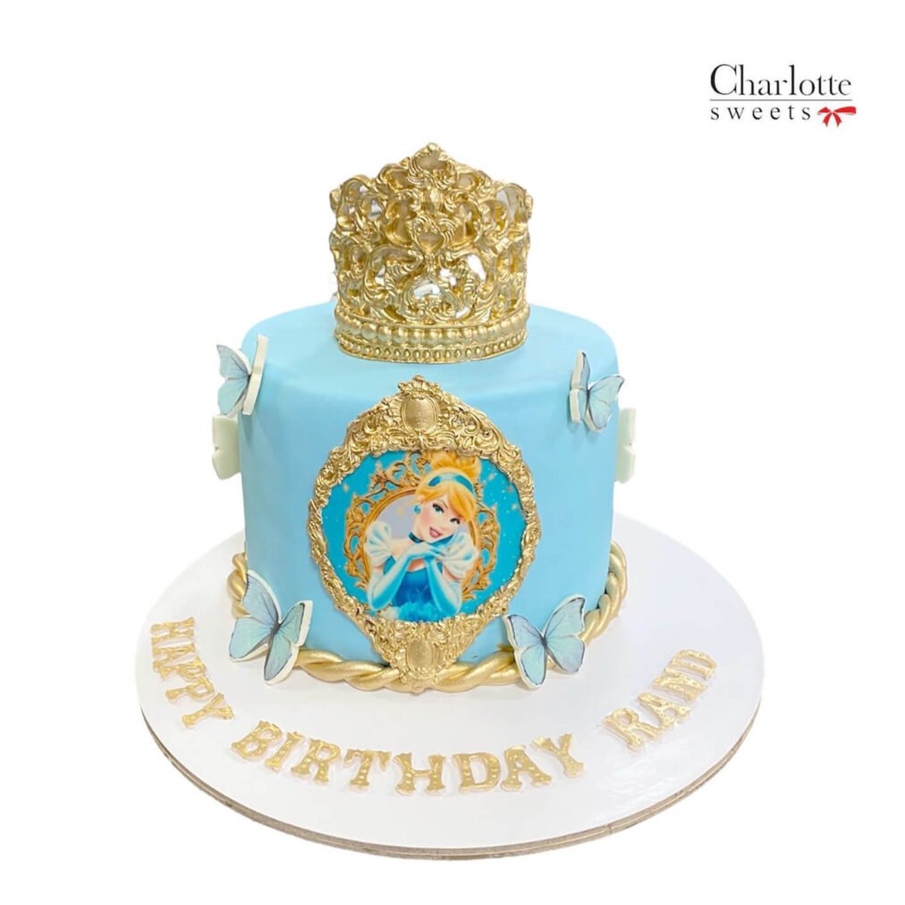 This is a light blue cylindrical cake themed around Cinderella, featuring a central oval frame with a printed image of the character. The cake is adorned with a gold crown topper, gold rope details, and light blue butterfly accents, with the message “HAPPY BIRTHDAY RAND” in gold lettering on the base. Order online for next-day delivery in Dubai, Sharjah, and Ajman.