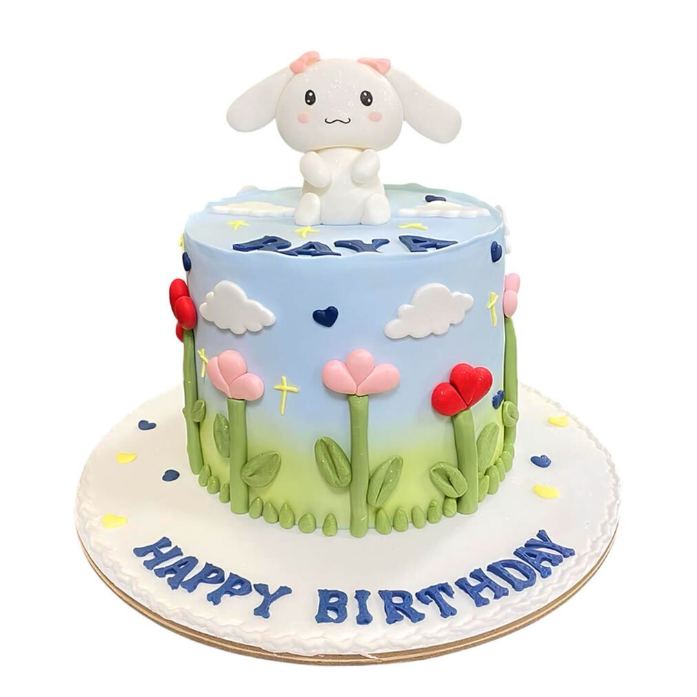 Celebrate with our Cinnamo Roll Cake, featuring a two‑tier pastel design with an adorable bunny topper, sky‑themed clouds and hearts, grassy garden details, and a bold custom name plaque. A sweet and personalized centerpiece for fans of cute characters and whimsical birthday themes. Order now for next-day delivery in Dubai, Sharjah, and