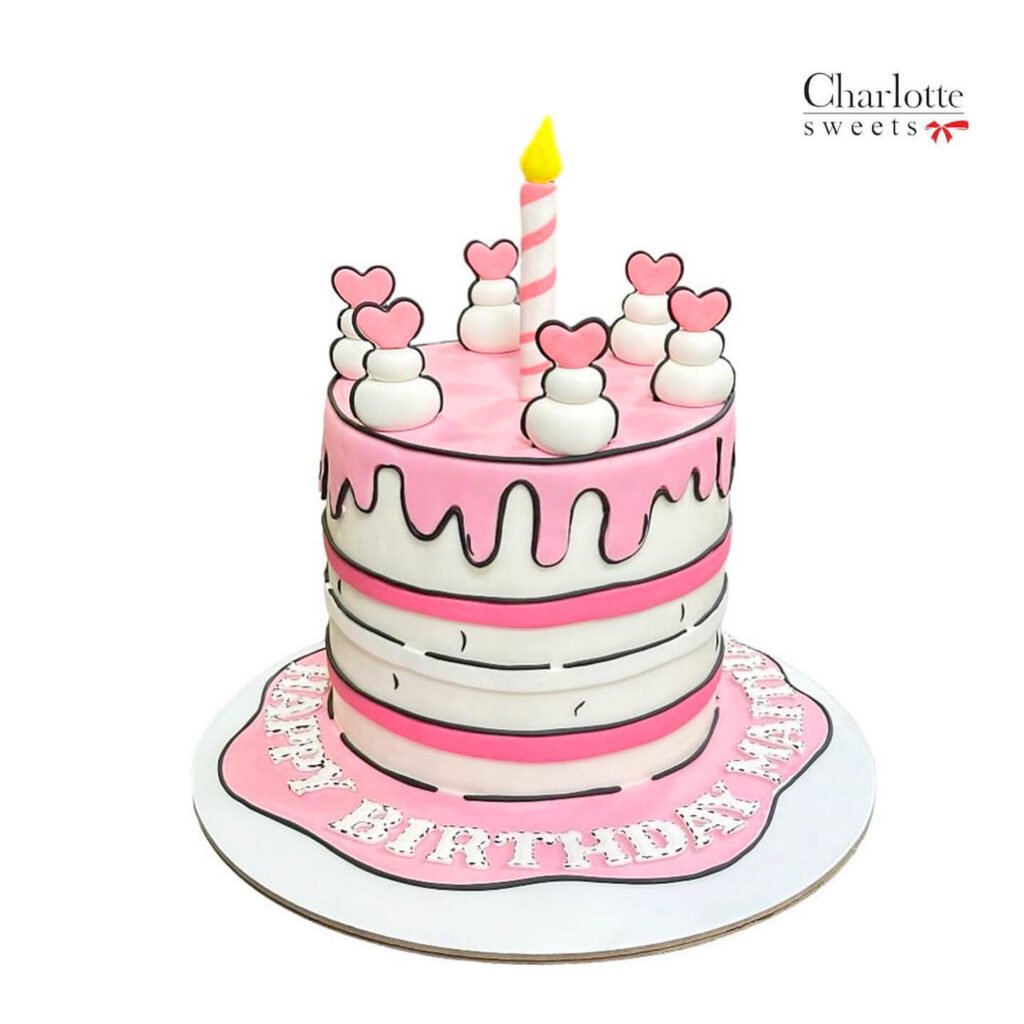 This adorable cake is perfect for a child’s birthday celebration. The pink and white color scheme, combined with playful heart shapes and a single candle, creates a cheerful and festive look. The personalized “Happy Birthday” message adds a special touch. Order online for next-day delivery in Dubai, Sharjah, and Ajman.
