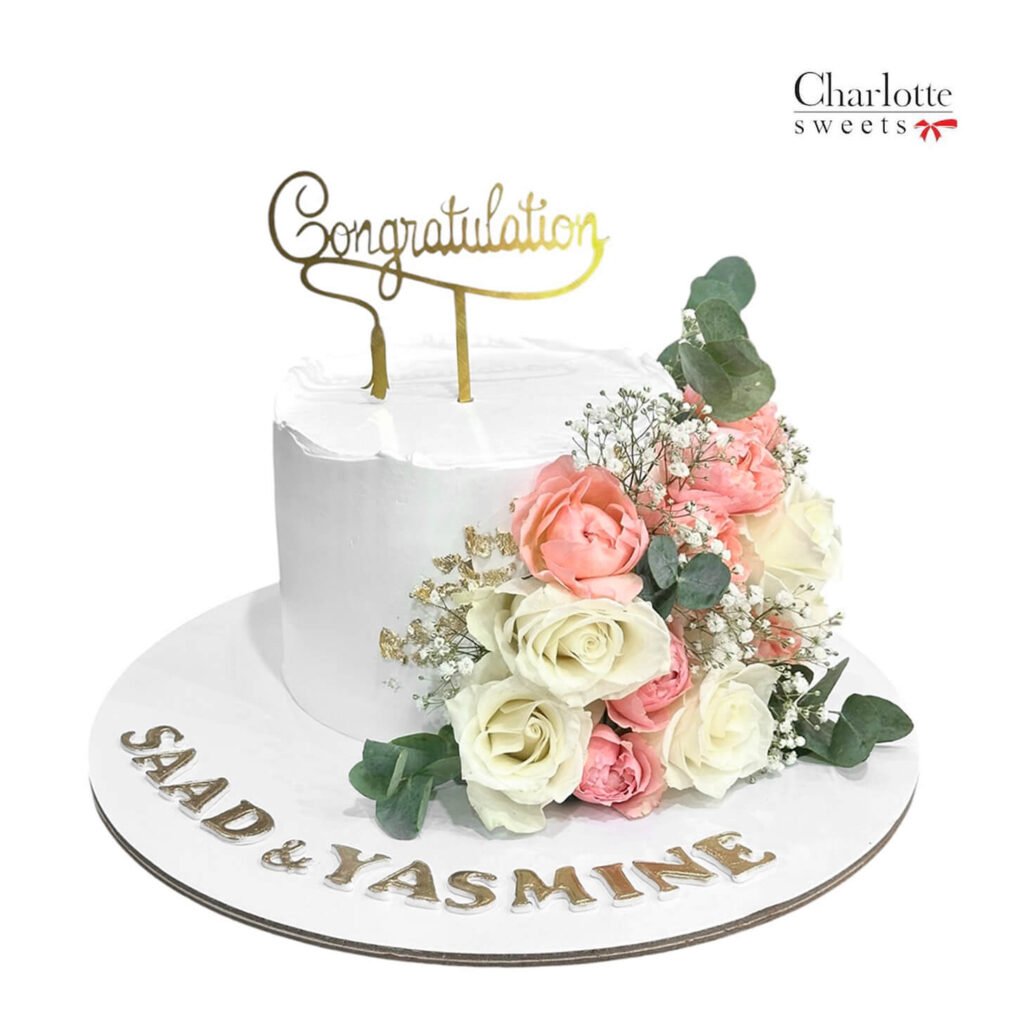 Celebrate life’s special milestones with our exquisite Congratulations Cake, featuring a smooth white frosting base adorned with a bouquet of delicate pink and white roses, baby’s breath, and greenery. A gold topper displaying “Congratulation” and elegant gold lettering reading “SAAD & YASMINE” along the cake board add a touch of sophistication, making it perfect for engagements, weddings, or achievements. Order online for next-day delivery in Dubai, Sharjah, and Ajman.