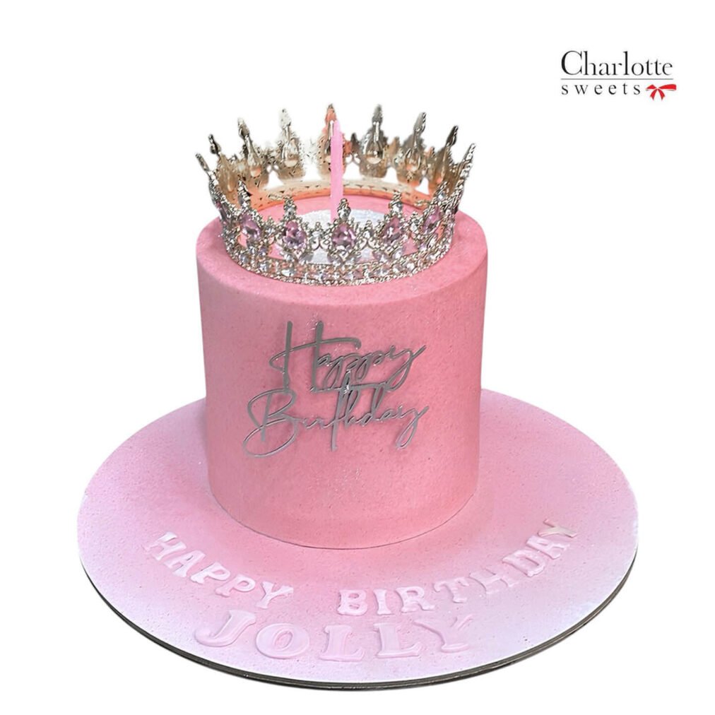 This is a cylindrical cake with a soft pink fondant covering, topped with a sparkling, translucent crown and a lit candle. The cake features a “Happy Birthday” inscription in a silver, cursive font, and the base displays the message “HAPPY BIRTHDAY JOLLY” in embossed lettering, all set against a backdrop of shimmering, glitter-like particles. Blow the Glitter and put the crown on the princess head. Order online for next-day delivery in Dubai, Sharjah, and Ajman.
