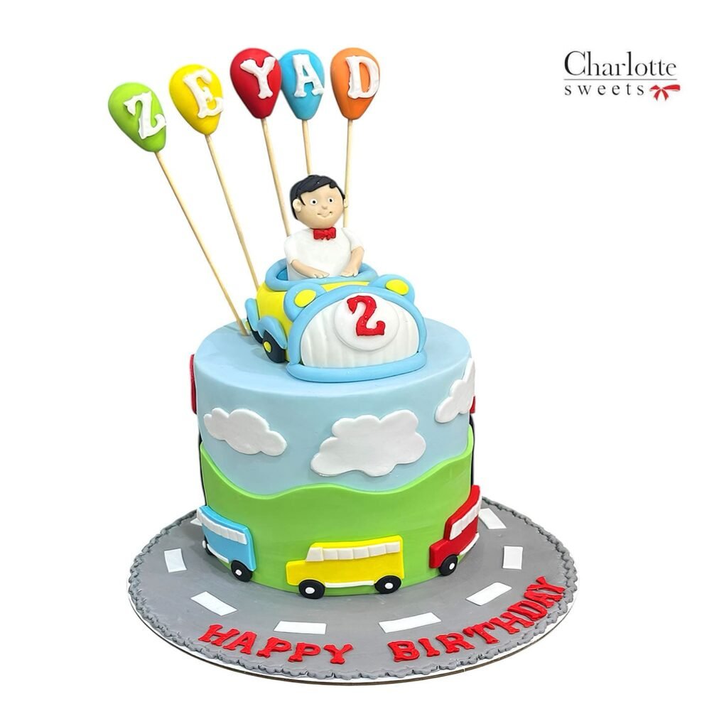Celebrate your little one’s special day with our vibrant Cute Car Cake, featuring toy cars, a road-themed design, and a cheerful figurine riding in a blue and yellow car. Complete with clouds, green hills, and colorful balloons spelling the celebrant’s name, this cake creates a fun and joyful atmosphere. Order online for next-day delivery in Dubai, Sharjah, and Ajman.