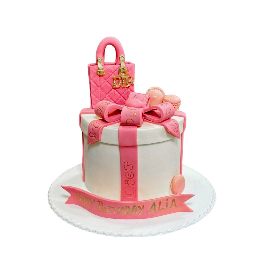 This elegant cake is perfect for the fashion-forward individual. Adorned with a stunning Christian Dior handbag cake and gift box, this cake is both beautiful and delicious. The personalized message “Happy Birthday Alia” adds a special touch. Order online for next-day delivery in Dubai, Sharjah, and Ajman.