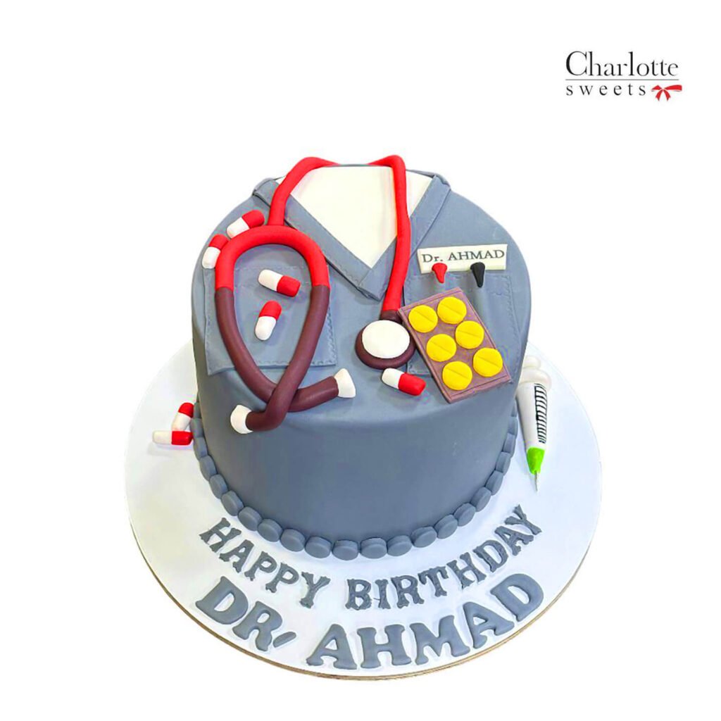 This unique and thoughtful cake is the perfect way to honor a doctor’s special day. The cake is designed to look like a doctor’s coat, complete with a stethoscope, pills, and a syringe. The name “Dr. Ahmad” is prominently displayed on the cake, making it a truly personalized treat. Order online for next-day delivery in Dubai, Sharjah, and Ajman.