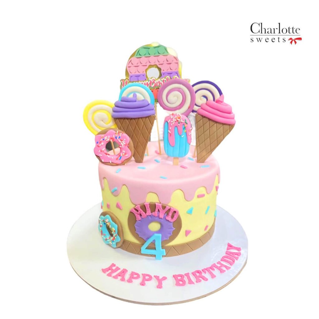 Indulge in a whimsical treat with this delightful ice cream and candy-themed birthday cake! Perfect for a 4th birthday celebration, this cake features a vibrant color palette and playful decorations. Topped with a giant donut and adorned with an array of charming candies, cookies, and lollipops, it’s a feast for the eyes and taste buds. The smooth pastel frosting and intricate details make this cake a true centerpiece. The “Happy Birthday” message adds a personal touch. Order online for next-day delivery in Dubai, Sharjah, and Ajman.
